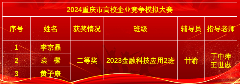 近日,2024年重庆市高校企业竞争模拟大赛总决赛在西南政法大学隆重举行。大赛由重庆市教育委员会主办,西南政法大学承办,中国管理现代化研究会决策模拟专业委员会协办。历经初赛、复赛的激烈角逐,全市共有34所高校87支队伍进入总决赛。我校管理与健康学院金融科技应用专业参赛队伍凭借扎实的专业技能、敏锐的市场洞察能力和出色的团队协作,一路披荆斩棘,最终脱颖而出,取得高职组二等奖一项。