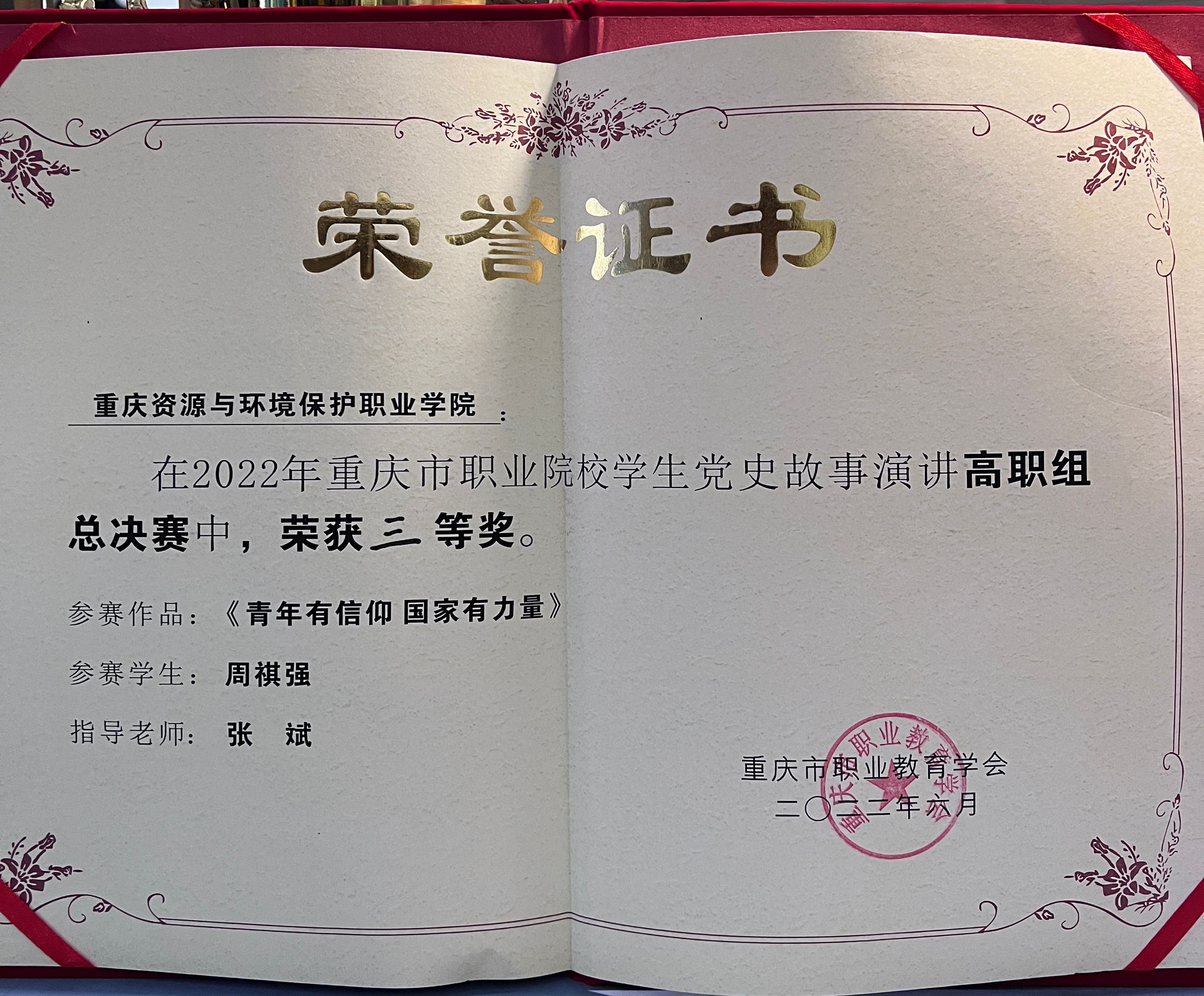 为迎接党的二十大胜利召开,深入贯彻落实习近平总书记关于职业教育“要坚持党的领导,坚持正确办学方向,坚持立德树人”的重要指示,进一步加强职业院校党史知识教育,让学生在党史故事中汲取奋进的力量,培养其爱党爱国之情,砥砺报国之志,实现“技能成才,强国有我”的梦想。我校学生周祺强同学于2022年6月28日参加重庆市职业院校学生党史故事演讲(高职组决赛)中荣获三等奖。