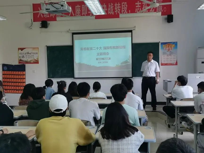 为喜迎党的二十大,庆祝中国共青团成立100周年,引导学校青年厚植爱党爱国爱社会主义的情怀,以红色传人之名赓续红色血脉,以青春奋斗之力勇担时代重任,不负韶华,不负时代,不负人民。近日,学校开展“青春献礼二十大,强国有我新征程”系列主题教育活动。院长开班会智能工程学院院长褚玉峰,近期走进不同班级,主持“青春献礼二十大,强国有我新征程”主题班会。班会上,他讲到,2022年是我国踏上全面建设社会主义现代