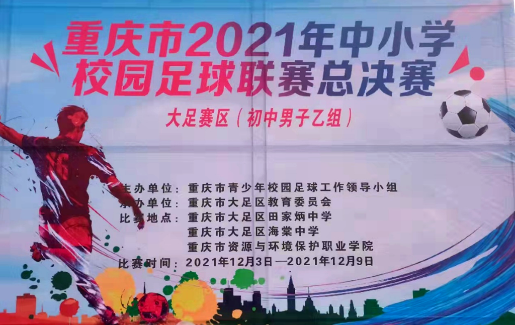 2021年12月3日,重庆市2021年中小学校园足球联赛总决赛大足赛区(初中男子乙组)在我校开赛了,本次比赛由重庆市青少年校园足球工作领导小组主办,由重庆市大足区教育委员会承办,比赛地点4个学校,共有重庆市大足区田家炳中学、重庆市大足区海棠中学、重庆市资源与环境保护职业学院,重庆资源与环境保护职业学院主要负责精英组C组和精英组D组的小组比赛。参赛队分别来自渝北、彭水、铜梁、巴南、九龙坡、江北、綦