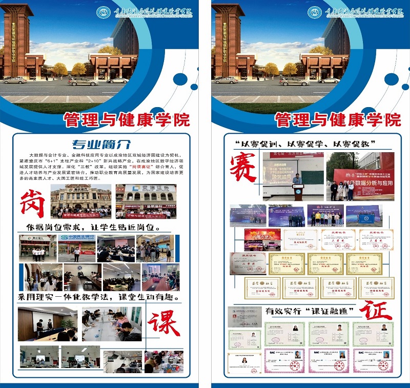 2021.12.16日,我校管理与健康学院圆满完成2021-2022第一学年期末教学成果展。本次活动包括从“岗—课—赛—证”四个方面充分展示了学院学生及教师的良好风貌。岗:依据岗位需求,让学生走近岗位,切实掌握岗位所要求能力,进而提高教学质量,为职业岗位提供更多优秀人才。健康类专业举办了2021级新生授服暨拜师仪式,邀请了医校企合作单位的重庆市大足区食品药品协会部长唐全东、重庆市大足区郭昌毕医院