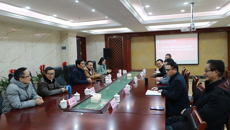 2021年11月23日下午,重庆电讯职业学院王柱京副校长,规划处处长王永斌、招生处处长黎晓燕、传媒学院院长任其华,五年制学院院长陈涛,一行五人来到重庆资源与环境保护职业学院,围绕学校管理、招生就业、规划发展、二级学院建设等方面交流指导工作。学院王平校长,校长助理朱凯及相关部门负责人与王柱京副校长一行在办公楼三楼会议室进行了深入的座谈交流,座谈会由朱凯主持。座谈会上,王平校长简要介绍了我校近年来办