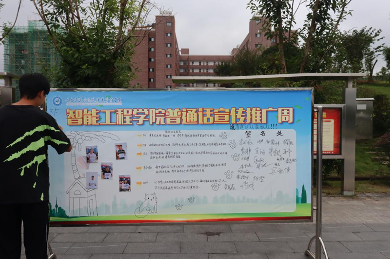 在“第24届全国推广普通话宣传周”到来之际,智能工程学院为充分发挥推普周的宣传教育和引领示范作用,切实做好普通话的宣传、推广和普及工作,按学校的安排和部署,开展了以“普通话诵百年伟业,规范字写时代新篇”为主题的系列推广宣传活动。9月13日,为了更好地向同学们展示普通话,引导同学们说普通话,杨佳宁,龚虹渝两名同学以视频的形式用普通话朗诵经典,展示普通话魅力。展示视频截图9月14日,智能工程学院学生