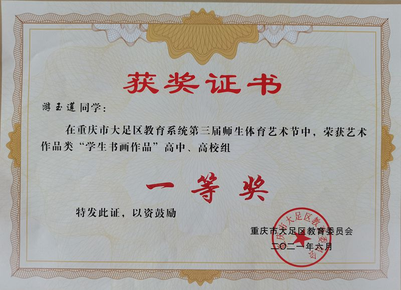 大足区庆祝“建党100周年”暨第三届师生体育艺术节,我校教育与体育学院喜获丰收,共计7件作品获奖。其中学生组获奖5件,游玉莲同学获得一等奖;龚柯继、欧阳蔚巍同学获得二等奖;田漫、熊小书同学获得三等奖。教师组获奖2件,张红老师、李中亚老师个人作品均获得二等奖。且张红老师荣获本届作品展指导教师一等奖;李中亚老师获指导教师二等奖;谢元亭老师获指导教师三等奖;陈云、邓梅、谢元亭老师获指导老师三等奖;郑清