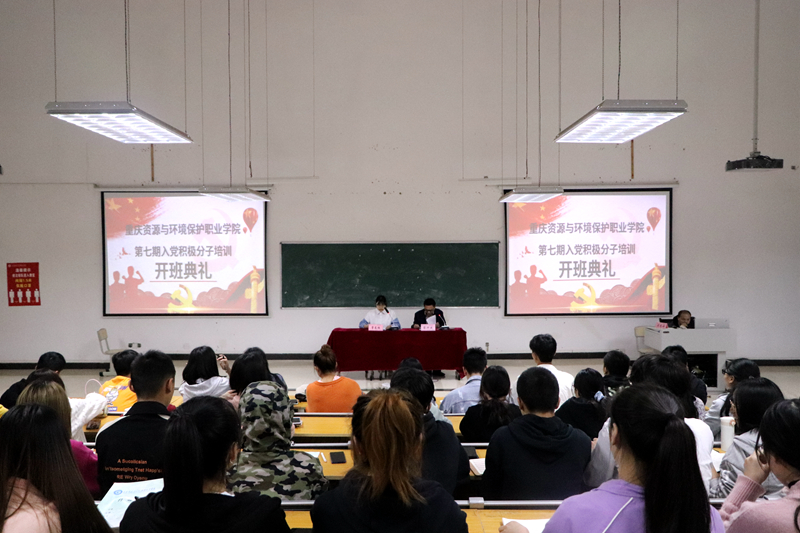 2021年5月17日晚,重庆资源与环境保护职业学院在教学楼J112举行第七期入党积极分子培训班结业典礼,学校组织部干事曹春梅主持结业典礼,党委委员、组织部部长出席典礼并讲话。全体学员起立奏唱国歌。本期入党积极分子培训班共有176名学员,培训为期7天,主要采取集中授课、自学及基本知识考试等多种形式进行,课程围绕系党情、懂党史、学党章、促党建、报党恩、守党纪、拥党权、入党前等内容开展。根据上课情况及