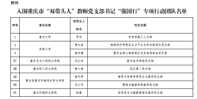 近日,中共重庆市委教育工作委员会印发了《关于公布全市高校“双带头人”教师党支部书记“强国行”专项行动团队名单的通知》,我校教育与体育学院教师党支部和管理与健康学院教师党支部成功入选。教师党支部书记谢元亭、马小凤两位同志入选重庆市“双带头人”教师党支部书记。此次专项行动旨在深入贯彻落实高校“双带头人”教师党支部书记培育工作的部署要求,充分发挥高校“双带头人”教师党支部书记的示范引领作用,引导广大师