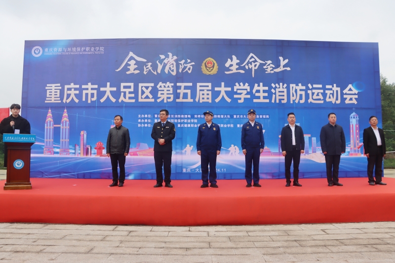 11月21日,重庆市大足区第五届大学生消防安全运动会在重庆资源与环境保护职业学院举行。本次活动由重庆市大足区消防救援局、双桥经开区消防救援大队主办,重庆资源与环境保护职业学院承办。重庆资源与环境保护职业学院全体师生员工,重庆健康职业学院、重庆工程学院、重庆电信职业学院、重庆科技学院参赛队员参加本次活动。重庆市大足区消防救援局局长李军,资环学院党委副书记、副校长郜发磊,大足区应急救援局,双桥经开区