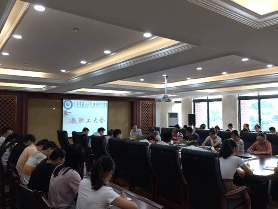 7月9日上午,学院在三楼会议室召开教职工大会,全体教职工参会,会议由姚木远书记主持,姚木远书记、向小明副院长、何福仁副院长三位院领导作重要讲话。姚书记从教学运行、队伍建设、校企合作、招生宣传、学生管理、后勤保障、党建和思想政治工作、接受年检等八个方面对本学期的各项工作进行了总结,并对暂时存在的问题进行了分析。姚书记指出,总体来说,本学期学院正常运转,各项工作进展顺利,校园安全稳定,对全体教职工表