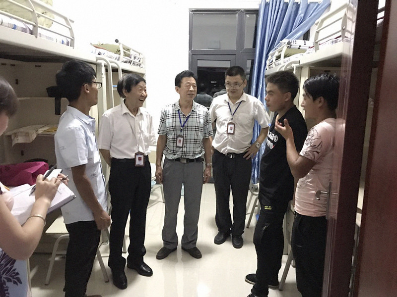 2017年8月27日晚8点半,学院领导姚木远、何福仁、学生处龙兴友等到学生公寓男生宿舍425、426、365等寝室看望了新同学,逐一走访各个寝室,与学生及家长亲切交谈,关注学生需求,宿舍冷热水供应情况,以及生活情况等。嘱咐同学们要加强交流,互相帮助、互相学习,尽快适应中学生到大学生身份的转变。